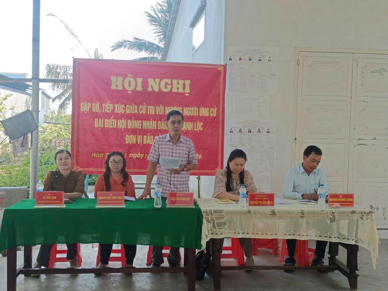 Từ ngày 09/3/2026 đến ngày 10/3/2026 tại xã Thạnh Lộc, Ủy ban MTTQ Việt Nam xã tổ chức Hội nghị tiếp xúc cử tri tại đơn vị bầu cử số 5 gồm: ấp Hòa Bình, ấp Hòa Thuận I, Hòa Thuận II để các ứng cử viên đại biểu HĐND xã nhiệm kỳ 2026 – 2031 vận động bầu cử.